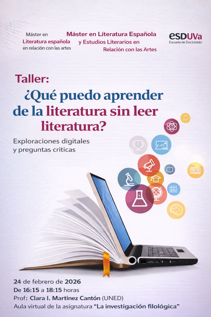 Invitación al taller impartido por Prof. Clara I. Martínez Cantón (UNED), "¿Qué puedo aprender de la literatura sin leer literatura? Exploraciones digitales y preguntas críticas"